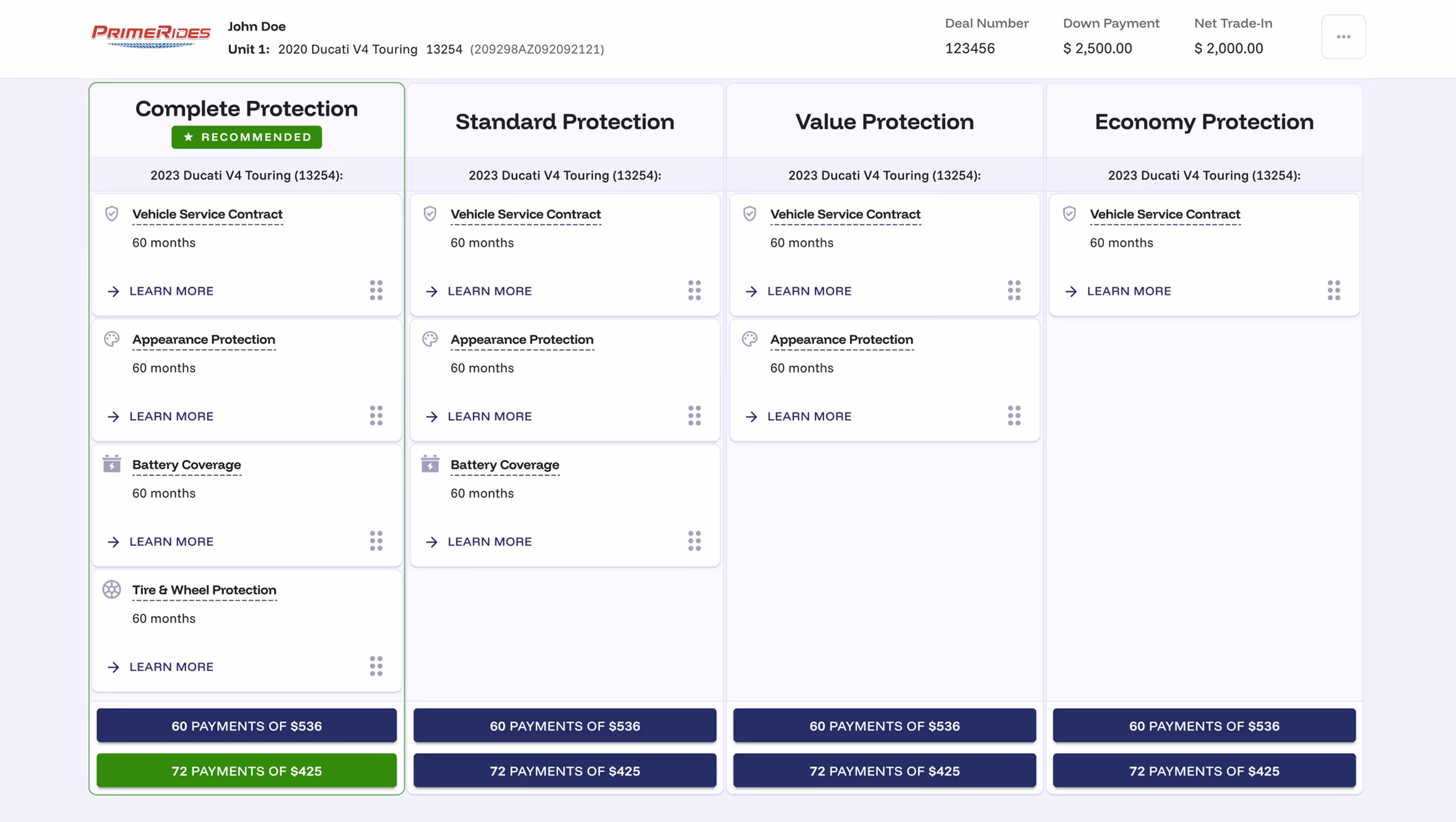 Product Lane: The built-in F&I menu uses dynamic, visually engaging presentations to connect with customers. Customers can explore protection options on screen — drag and drop coverage packages, see monthly payments, and finalize decisions with confidence. Real-time rate data and instant eContracting link directly to providers, delivering consistent, accurate, and compelling product offers that boost penetration and profit per retail unit.